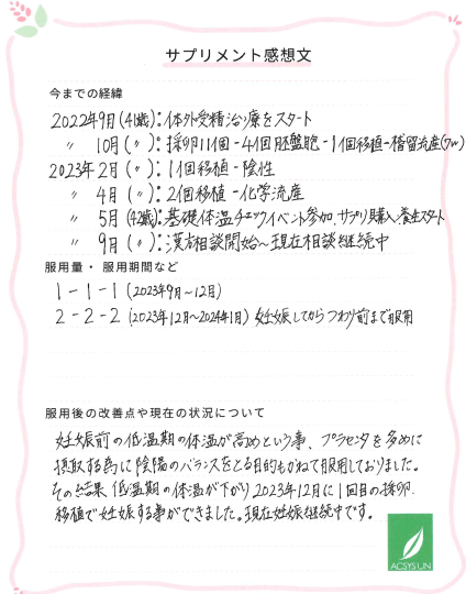 その結果 低温期の体温が下がり 2023年12月に1回目の採卵、移植で妊娠する事ができました。現在妊娠継続中です。