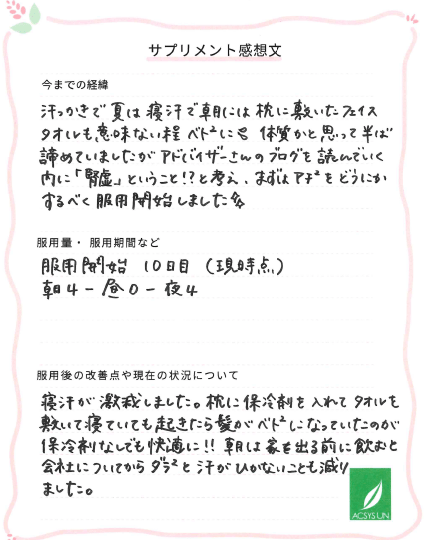 体質かと思って半ば諦めていましたが アドバイザーさんのブログを読んでいく内に「腎虚」ということ!?と考え、まずはアチアチをどうにかするべく服用開始しました。
