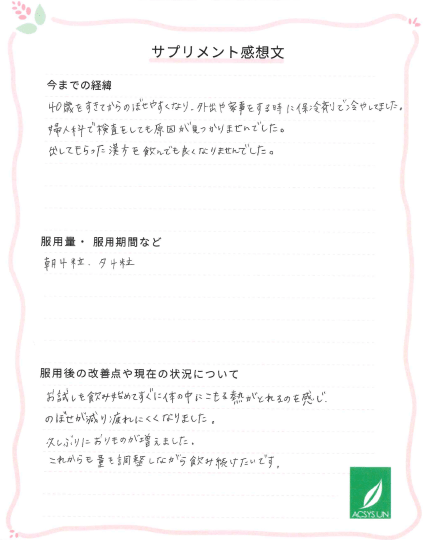 お試しを飲み始めてすぐに体の中にこもる熱がとれるのを感じ、のぼせが減り 疲れにくくなりました。