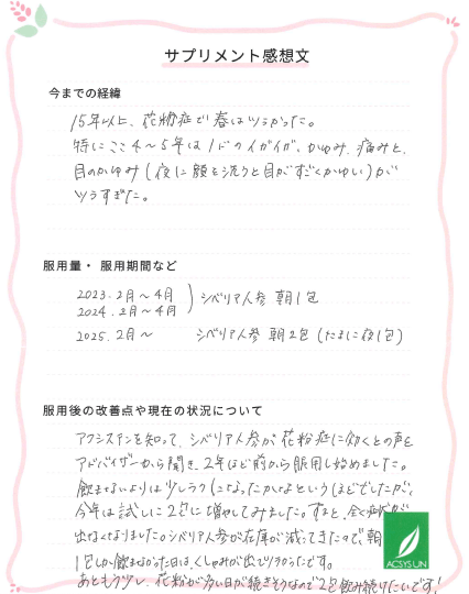 アクシスアンを知って、シベリア人参が花粉症に効くとの声をアドバイザーから聞き、2年ほど前から服用し始めました。