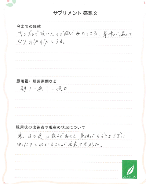 サンプルで頂いたので飲んでみたところ、身体が温かくなりポカポカとする。