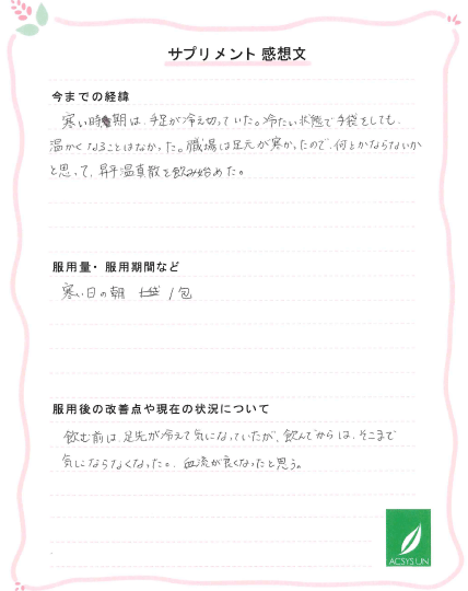 飲む前は、足先が冷えて気になっていたが、飲んでからは、そこまで気にならなくなった。