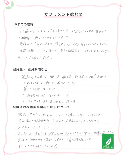 服用してから、身体がじんわり温かくなり、以前より冷え症が改善され、気づいたら貼るカイロをしなくても大丈夫になりました。