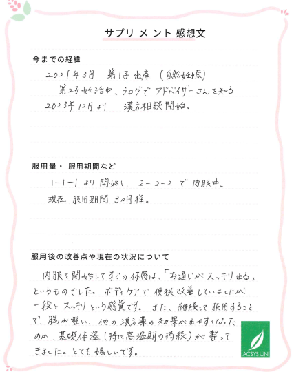 また、継続して服用することで、腸が整い、他の漢方薬の効果が出やすくなったのか、基礎体温(特に高温期の持続)が整ってきました。