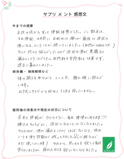 長年の便秘がウソのように、毎日排便があります!!!!