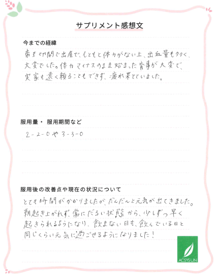 朝起き上がれず、常にだるい状態から、少しずつ早く起きられるようになり、飲まない日も、飲んでいる日と同じくらい元気に過ごせるようになりました!