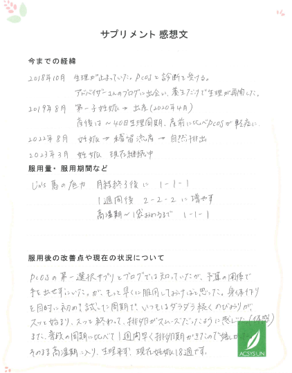 2018年10月 生理が止まっていた。PCOSと診断を受ける。アドバイザーさんのブログに出会い、養生だけで生理が再開した。