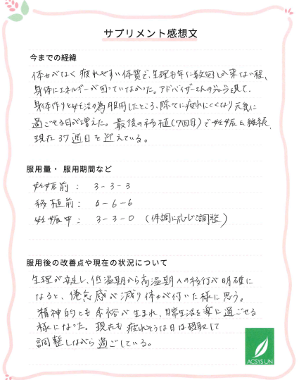 アドバイザーさんのブログを見て、身体作りと妊活の為服用したところ、徐々に疲れにくくなり元気に過ごせる日が増えた。
