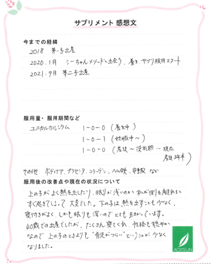 40歳での出産でしたが、たくさん寝てくれ、性格も穏やかなので 上の子のときよりも“育児がつらい“ということが少なくなりました。