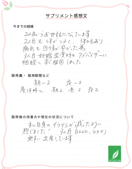 2人目も 体がつよく、体力もあり 病気も回復が早かった為 3人目妊娠発覚時も アドバイザーに相談し すぐ服用しました