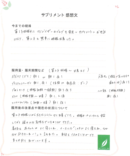 第1子妊娠中に アドバイザーのブログを発見し サプリメントにお世話になり、第2子も無事に妊娠出産した。