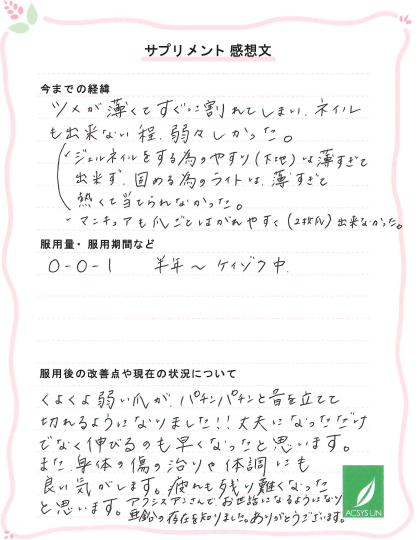 ツメが薄くてすぐに割れてしまい、ネイルも出来ない程、弱々しかった。